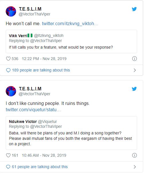 He was also asked for what his response would be if MI calls him for a feature. He responded saying that the rapper would never call him for a collaboration. He further revealed that he would rather work with Jesse Jags than work with MI himself.