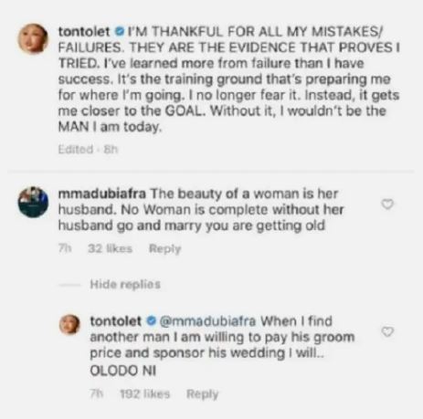 In response, Tonto said; “When I find another man I am wiling to pay his groom price and sponsor his wedding. I will”