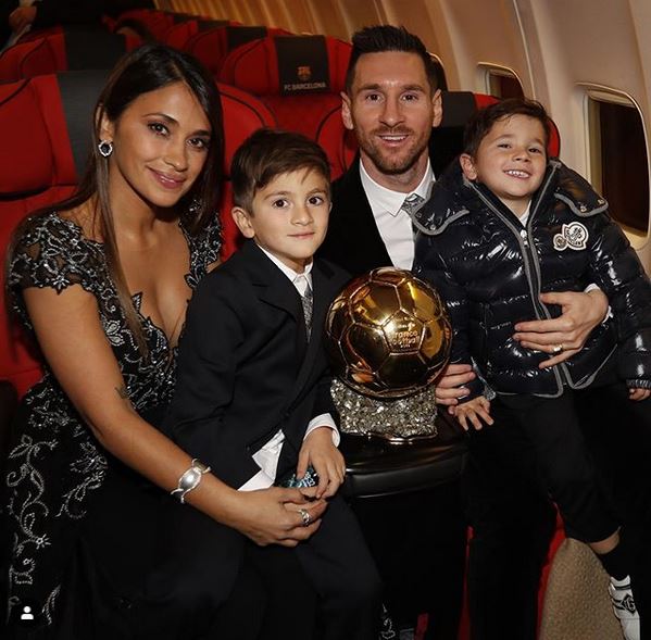 Taking to his Instagram page hours ago, the Barcelona and Argentine playmaker shared a family photo of himself (seen above) posing with his new trophy alongside his wife, Antonella Roccuzzo and their sons, Thiago and Mateo.