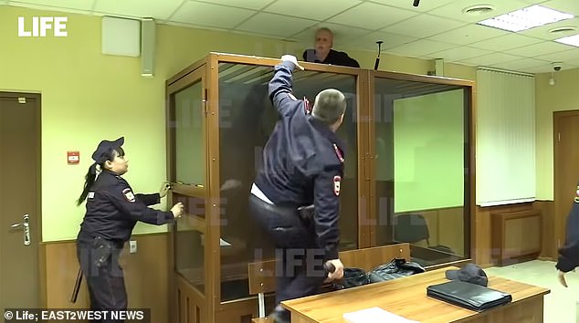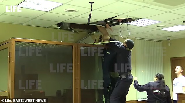 Leonid Greyser, 18, was captured on camera climbing through a hole in the roof of the courtroom dock at Scherbinsky District Court in Moscow.
