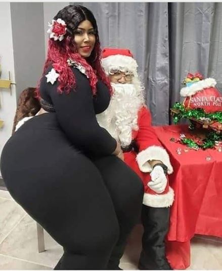 A picture of a plus-sized woman hanging around Santa Claus during a gift-sharing session has got people talking online. Many believe the picture isn't real as the lady with a huge body mass could have dislocated the leg of the man in question.