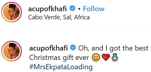 Apparently, congratulations are in order on Instagram as khafi Kareem, one of the BBNaija season 4 house mate took to Instagram to announce that she said yes to Gedoni Ekpata after he popped the big question.