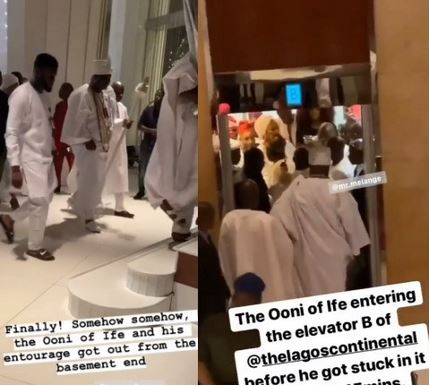It has been reported that there was panic at a Lagos Hotel last night when the Ooni of Ife, Oba Adeyeye Ogunwusi, got stuck inside the elevator in the Hotel.