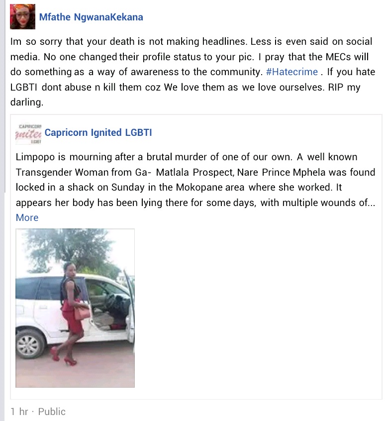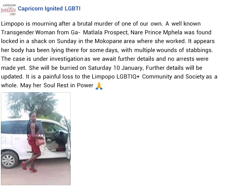 "Limpopo is mourning after a brutal murder of one of our own. A well known Transgender Woman from Ga- Matlala Prospect, Nare Prince Mphela was found locked in a shack on Sunday in the Mokopane area where she worked. It appears her body has been lying there for some days, with multiple wounds of stabbings. The case is under investigation as we await further details and no arrests were made yet. She will be burried on Saturday 10 January, Further details will be updated. It is a painful loss to the Limpopo LGBTIQ+ Community and Society as a whole. May her Soul Rest in Power" it said