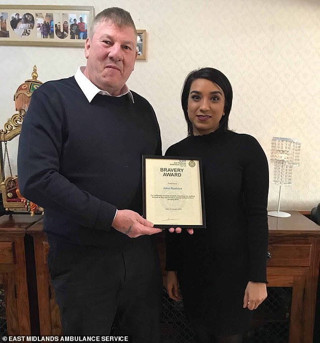 In recognition of Mr Rastrick's life-saving actions, the crew who attended the scene presented him with an East Midlands Ambulance Service (EMAS) Bravery Award (pictured, with Pari Mistry)