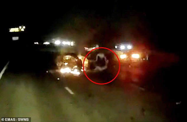 Dramatic dashcam footage showed one of the cars engulfed in flames in the middle lane while the other car had struck the central barrier.