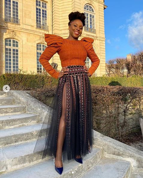 Adichie is seen pairing the skirt with an orange top and blue shoes.
