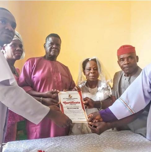 "And just yesterday he wedded her at St. Theresa's Catholic Church in Enugukwu, Anambra State. Mr. Okeke is a Lagos businessman while his new bride works in Anambra. Having found happiness, the groom who lost his first wife many years ago is giving himself another chance ?