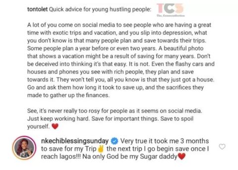 “A lot of you come on social media to see people who are having a great time with exotic trips and vacation, and you slip into depression, what you don’t know is that many people plan and save towards their trips. Some people plan a year before or even two years. A beautiful photo that shows a vacation might be a result of saving for many years. Don’t be deceived into thinking it’s that easy. It is not. Even the flashy cars and houses and phones you see with rich people, they plan and save towards it. They won’t tell you, all you know is that they just got a house. Go and ask them how long it took to save up, and the sacrifices they made to gather up the finances.“See, it’s never really too rosy for people as it seems on social media. Just keep working hard. Save for important things. Save to spoil yourself”.