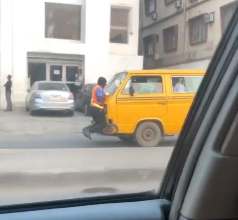 A police officer has been given the fright of his life after a danfo driver sped off as he clinged on to the car's bonnet.