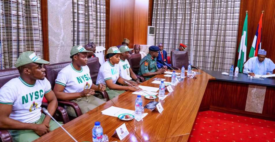 President Muhammadu Buhari on Thursday received members of the National Youth Service Corps (NYSC) scheme, who were in the Presidential Villa, Abuja, on a ‘thank-you’ mission over their new allowances.