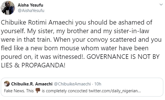However, Aisha Yesufu slammed the Minister stating that he should be ''ashamed'' of himself as her relatives who were on the train, saidthat Amaechi was spotted running during the attack.
