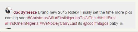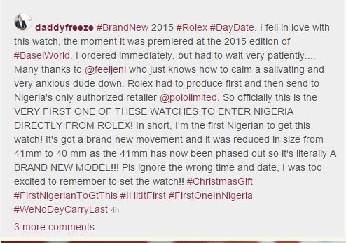 Nigerian OAP and motivational speaker, Daddy Freeze has made history being the first Nigerian to buy a brand new 2015 Rolex Daydate with a huge price tag.