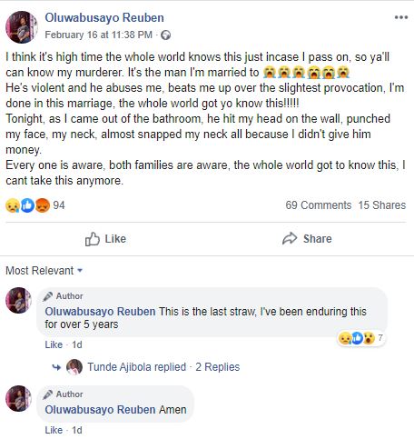 “I think it’s high time the whole world knows this just incase I pass on, so ya’ll can know my murderer. It’s the man I’m married to
