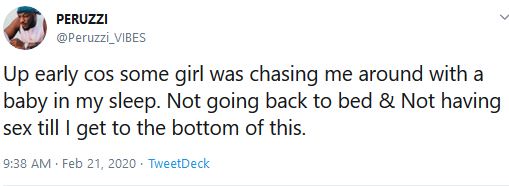 He wrote: "Up early cos some girl was chasing me around with a baby in my sleep. Not going back to bed & Not having sex till I get to the bottom of this."