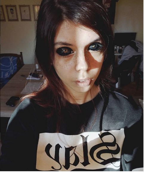 25-year-old Aleksandra Sadowska from the city of Wroclaw in the west of Poland reportedly went to the tattooist to dye her eyeballs black so that she can look like rap artist Popek, who also had his eyes dyed black.