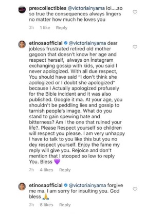 "Etinosa who fired back at Victoria Inyama, described her as a "jobless, frustrated and retired old mother who doesn’t know her age and respect herself on?Instagram."