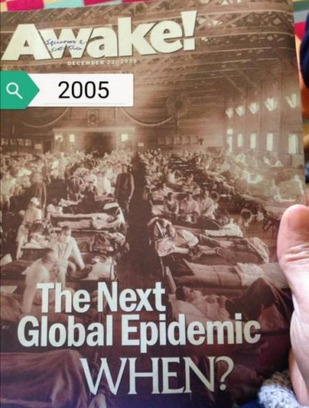The Awake magazine writer in predicting another virus quoted the medical journal, Vaccine, of 2003, which warned: “It has been 35 years since the last influenza pandemic, and the longest interval between pandemics recorded with certainty in 39 years. The pandemic virus may emerge in China or a nearby country and could surface from antigens or virulence factors derived from animal influenza viruses.