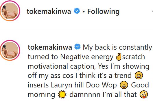 “My back is constantly turned to negative energy scratch motivational caption. Yes, I’m showing off my a** because I think it’s a trend and inserts Lauryn hill Doo Wop. Good morning, damn I’m all that,” she wrote on Instagram.