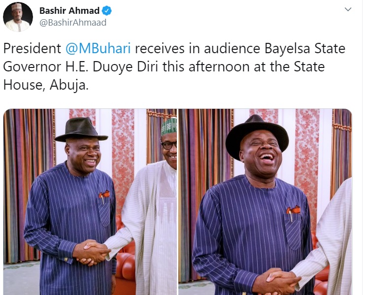 "President @MBuhari receives in audience Bayelsa State Governor H.E. Duoye Diri this afternoon at the State House, Abuja-BA."