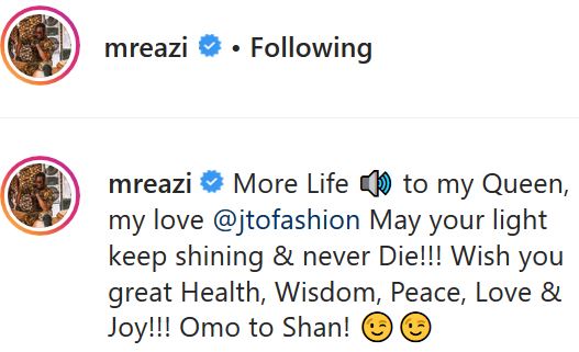 He then captioned the photo thus: 'More Life to my Queen, my love @jtofashion May your light keep shining & never Die!!! Wish you great Health, Wisdom, Peace, Love & Joy!!! Omo to Shan!. '