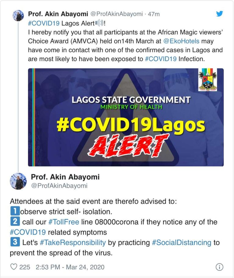 "COVID19 Lagos Alert! I hereby notify you that all participants at the African Magic viewers’ Choice Award (AMVCA) held on14th March at EkoHotels may have come in contact with one of the confirmed cases in Lagos and are most likely to have been exposed to COVID-19 Infection.