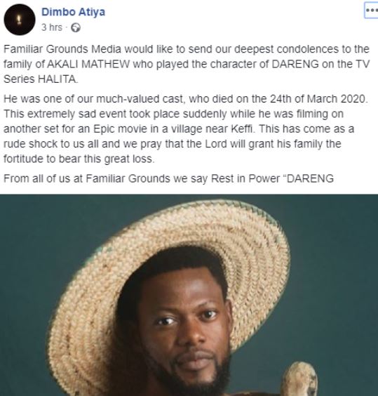 Dimbo Atiya who shared the news of his demise on Facebook said Matt passed on at around 7 pm “suddenly while he was filming on a set for an epic movie in a village near Keffi.”