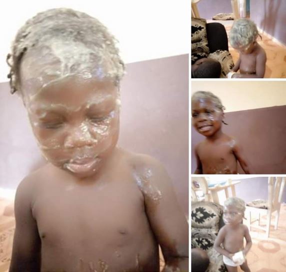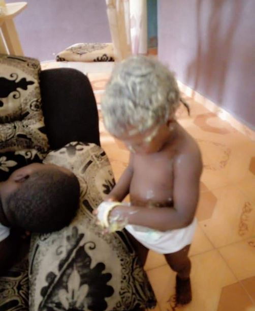 He shared a photo of his daughter, who had emptied a jar of cream on herself and also on him while he slept, and narrated how his wife has been the one running around, trying to make her behave.