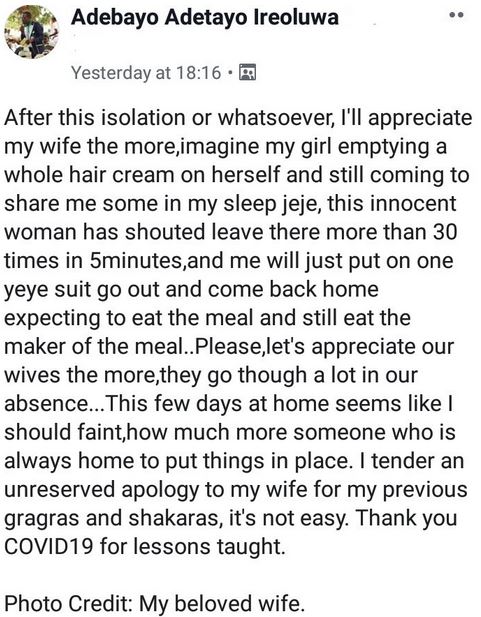 "Please, let's appreciate our wives the more,they go though a lot in our absence...This few days at home seems like I should faint,how much more someone who is always home to put things in place. I tender an unreserved apology to my wife for my previous gragras and shakaras, it's not easy. Thank you COVID19 for lessons taught."
