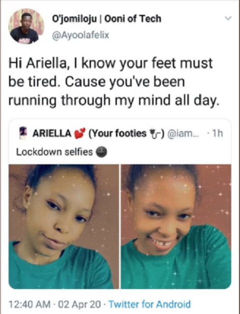 Twitter user, @Ayoolafelix, hoping to win her heart, reacted to her tweet, writing: "Hi Ariella, I know your feet must be tired. Cause you've been running through my mind all day.