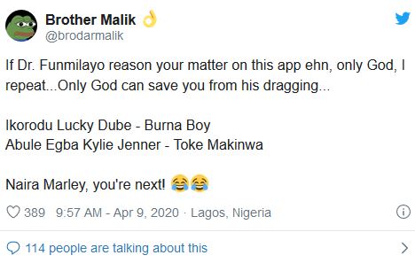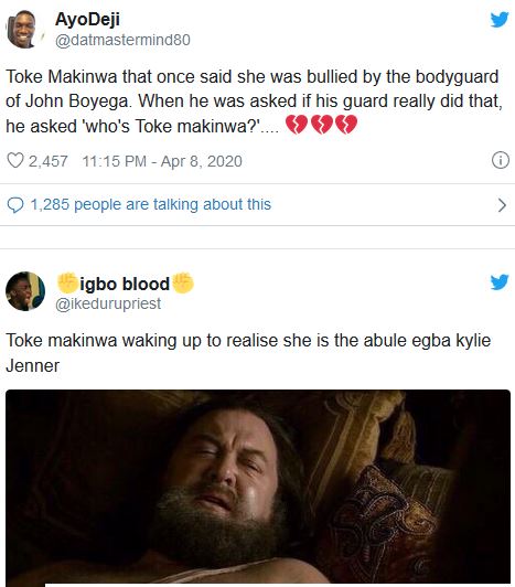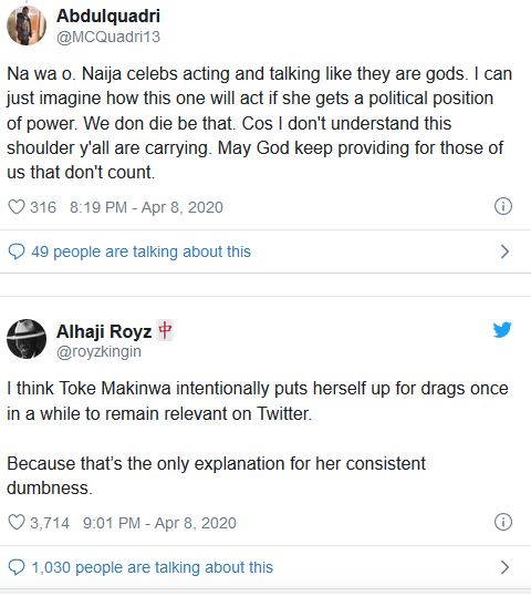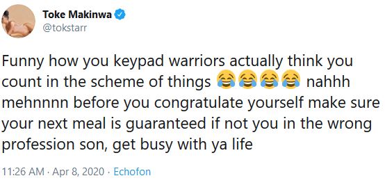 She tweeted, “Funny how you keypad warriors actually think you count in the scheme of things Face with tears of joyFace with tears of joyFace with tears of joyFace with tears of joy nahhh mehnnnn before you congratulate yourself make sure your next meal is guaranteed if not you in the wrong profession son, get busy with ya life.”
