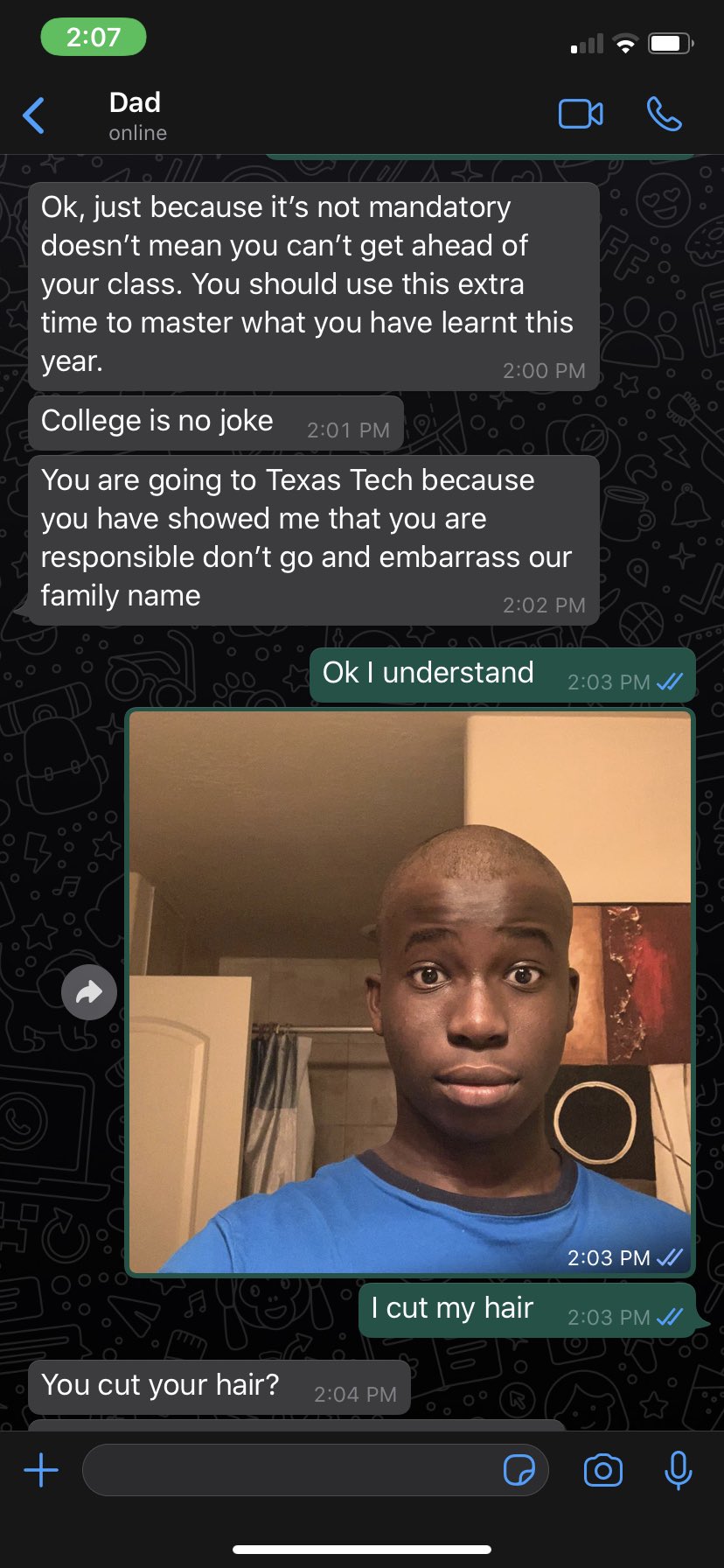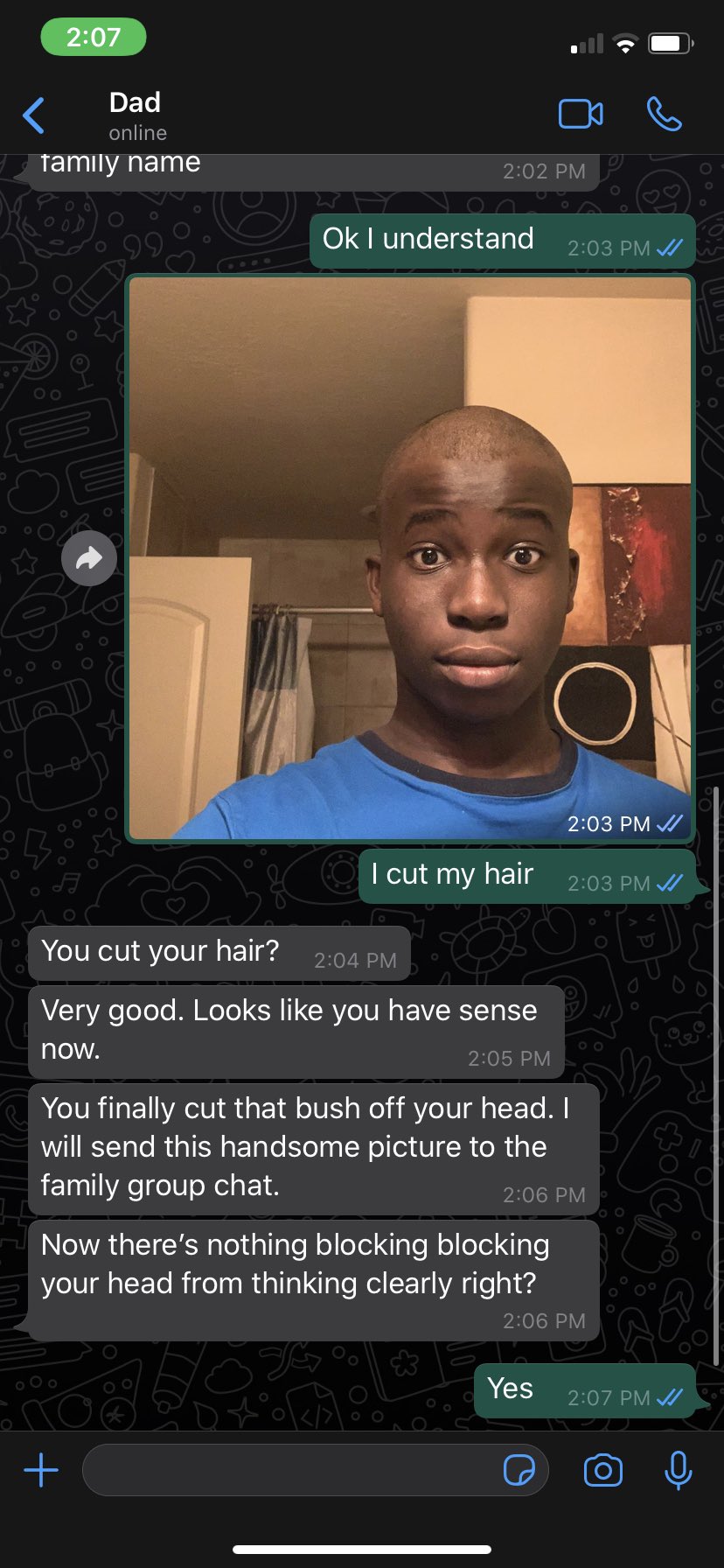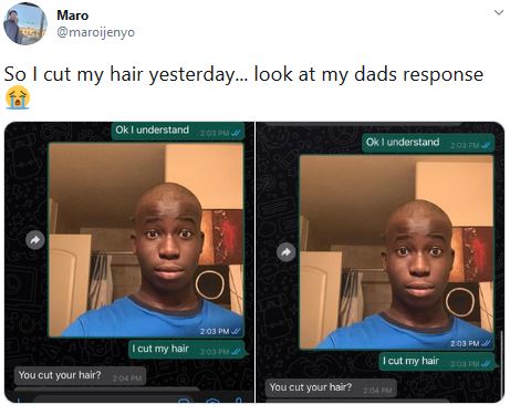 "So I cut my hair yesterday... look at my dads response," Maroijenyo tweeted alongside screenshots of his chat with his father.