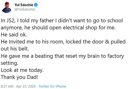 Yul, who made the revelation on his Twitter page, explained that he was in JJS2 when it happened. According to him, he went to his father and told him that he didn't want to go to school again.