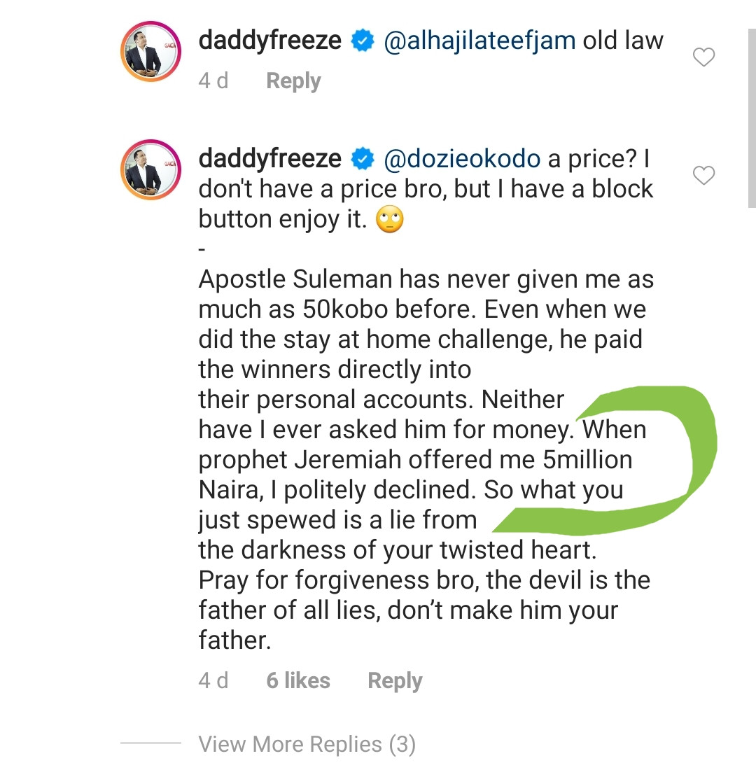 “The Man of God is known for his humanitarian activities and general goodwill, and the information being passed around is quite misleading. Daddy Freeze should not have used Prophet Jeremiah’s charitable gestures as reference, in whatever defense he was trying to make for Apostle Suleman. It is quite offensive and misleading, and we have since gotten public insinuations that Prophet Jeremiah offered Daddy Freeze a Five million naira bribe. Let it be very clear that the purpose of this money offered was to assist Nigerians during this Lockdown and not as a gift to Daddy Freeze, as his statement may insinuate.