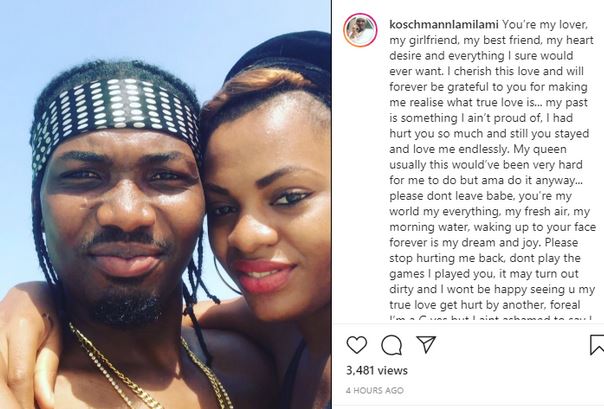 "My queen usually this would’ve been very hard for me to do but ama do it anyway... please dont leave babe, you’re my world my everything, my fresh air, my morning water, waking up to your face forever is my dream and joy. Please stop hurting me back, dont play the games I played you, it may turn out dirty and I wont be happy seeing u my true love get hurt by another, foreal I’m a G yes but I aint ashamed to say I led you there and I will never be too big to walk myself back to the basics of when our love was the greatest, come back to me my homie, fall for me again my flower, this time I am taking exception for you, the bullet has pierced my chest and I am bleeding badly inside out as I have felt something I have never felt.