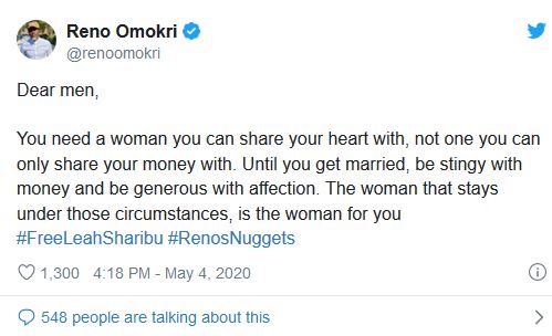 Reno Omokri stated that men need a woman they can share their heart with and not just one they can share their cash with.