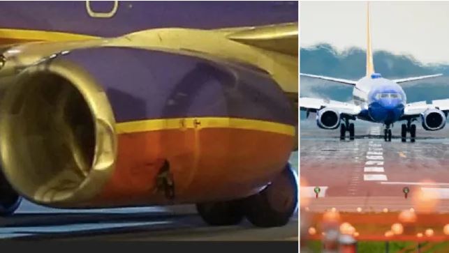 A Southwest Airlines Boeing 737’s engine damage is visible after it struck and killed a man walking on the runway of Austin-Bergstrom International Airport in Texas Thursday night (Pictures: CBS/EPA(file))