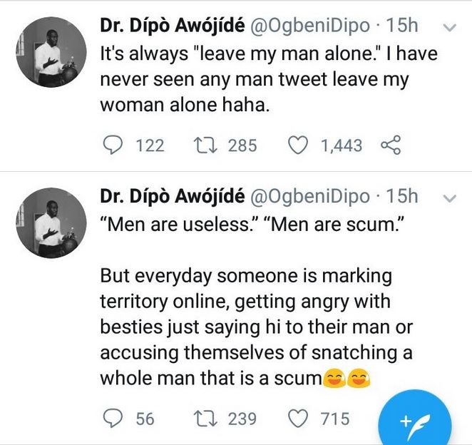 He wrote: "“Men are useless.” “Men are scum.” But everyday someone is marking territory online, getting angry with besties just saying hi to their man or accusing themselves of snatching a whole man that is a scum.