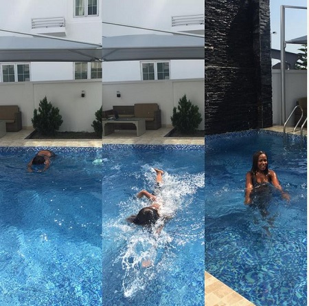 She uploaded the pictures and captioned them: "And they didn't know I could swim a little sha lol The joy of having a pool in ur home! Lol.."