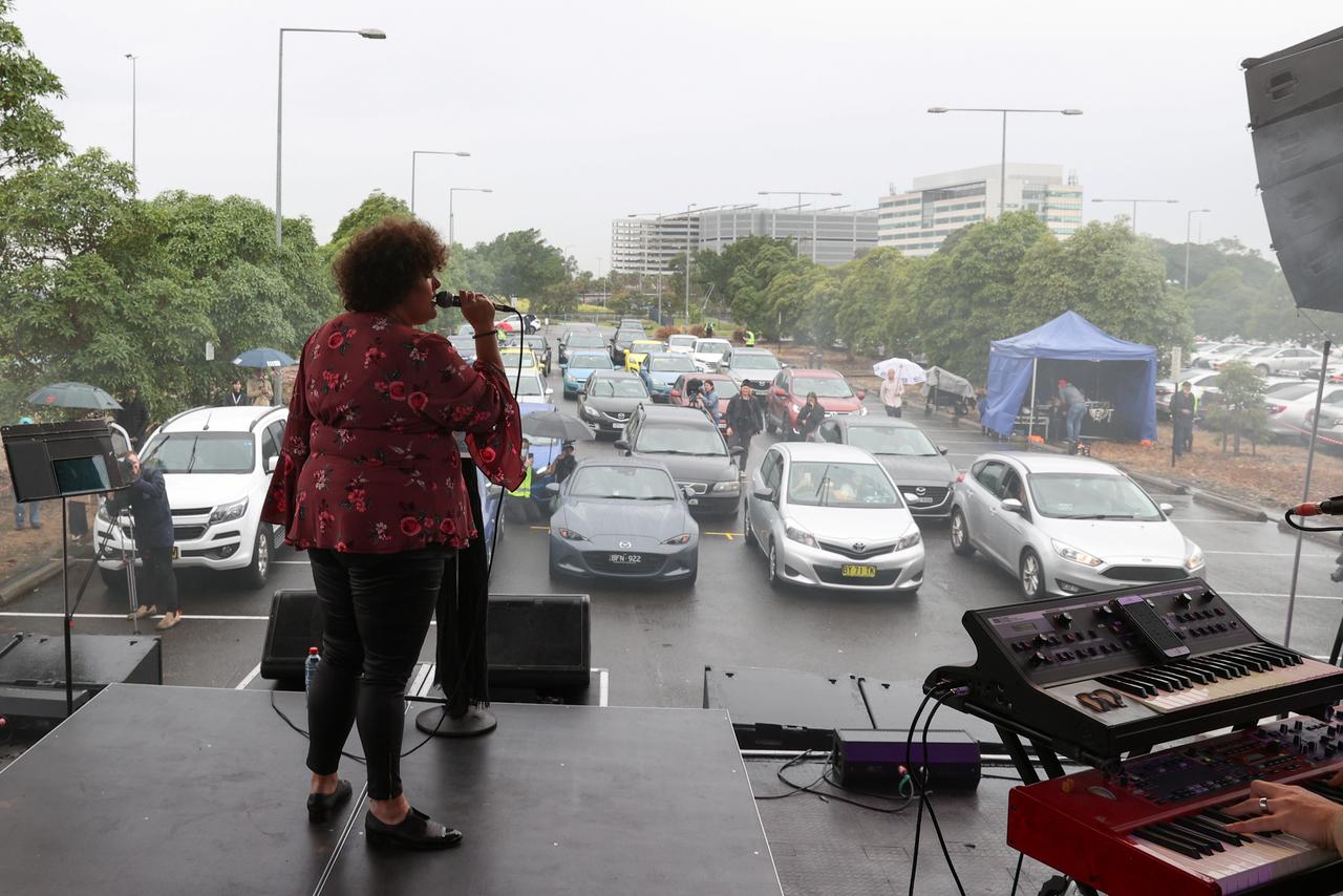 Singer-songwriter Casey Donovan performed on stage in Sydney on Thursday in a free concert that treated fans to some of the first live music many had heard in months. But they had to stay in their cars to enjoy it, Reuters reports.