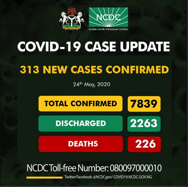 313 new cases of COVID-19 were recorded in Nigeria on Sunday, May 24, 2020.