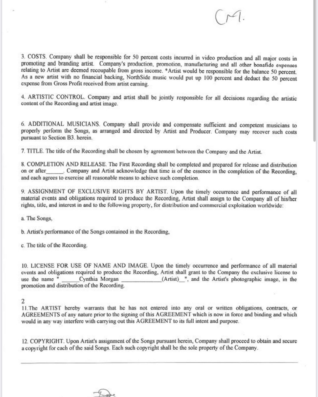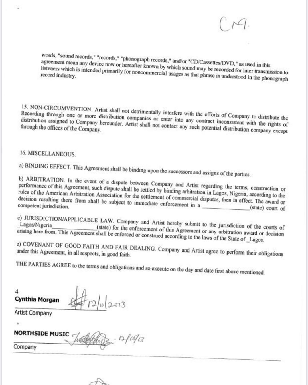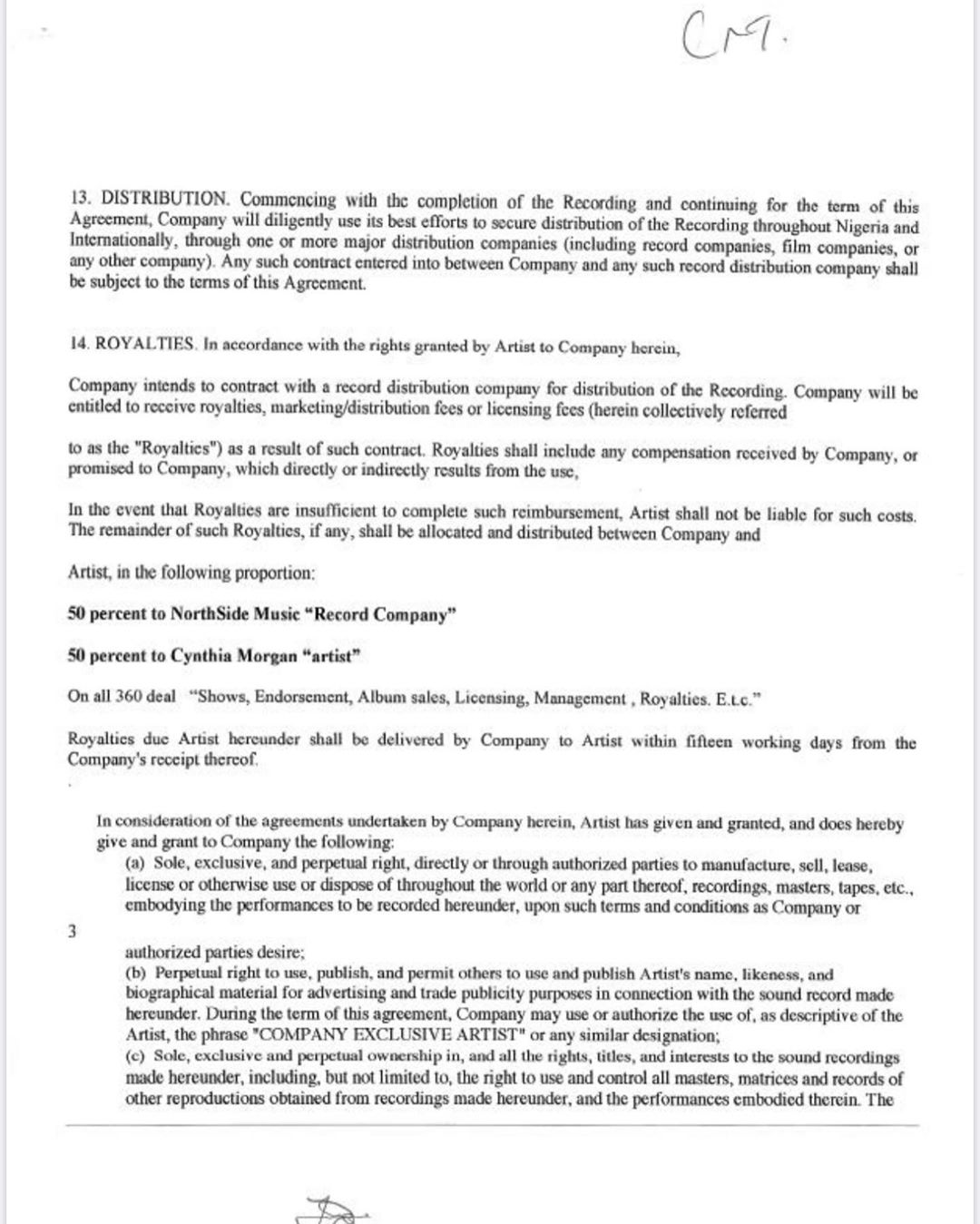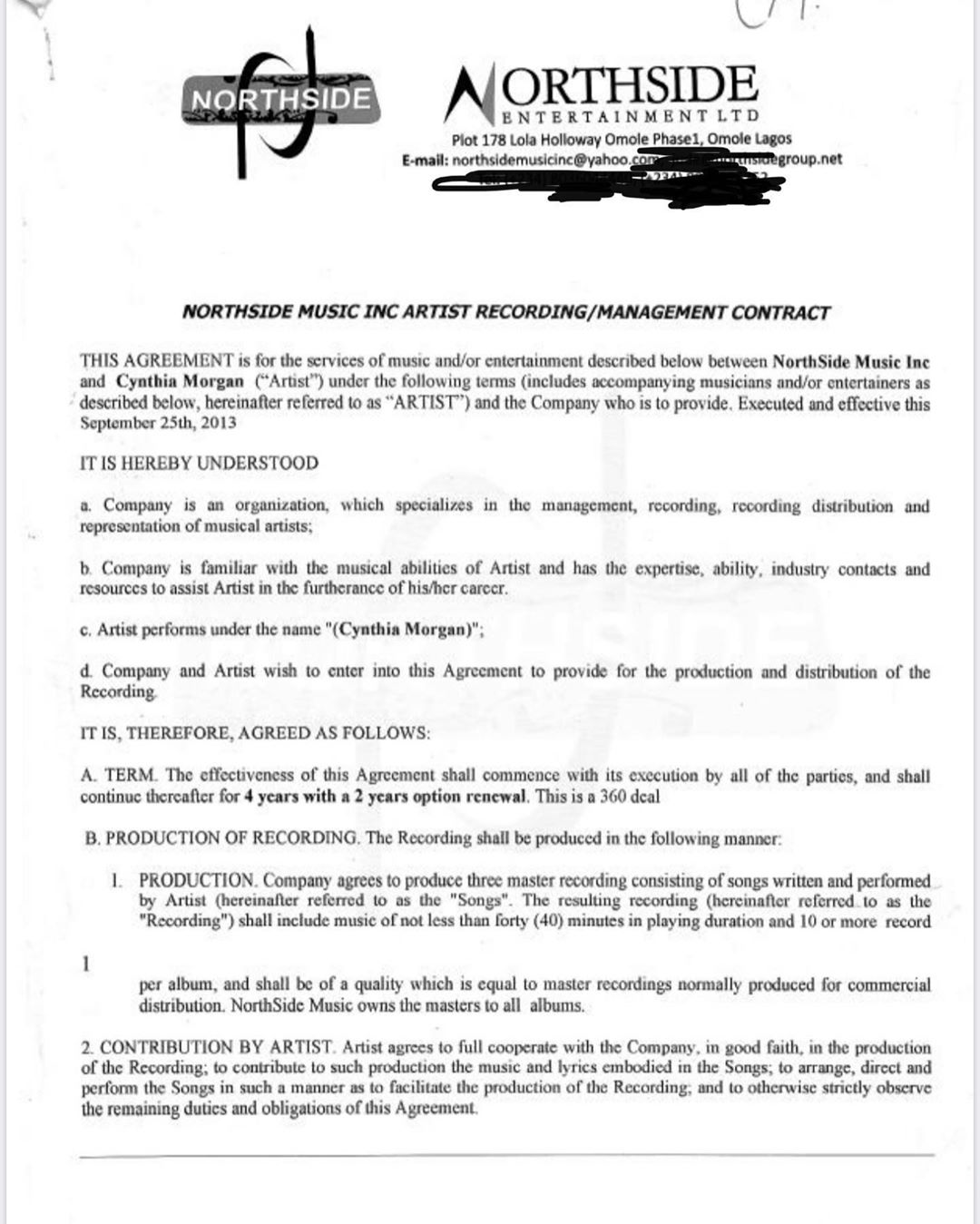 According to the terms of the contract, Cynthia Morgan and Northside Music had a 50/50 sharing formulae. Considering that she was a new artist at the time, Northside agreed to put up 100 per cent of the expense of which 50 would be deducted from the Morgan’s earnings.