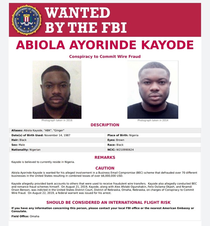 Abiola Ayorinde Kayode is wanted for his alleged involvement in a Business Email Compromise (BEC) scheme that defrauded over 70 different businesses in the United States resulting in combined losses of over $6,000,000 USD.