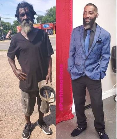 The photo shows the man in extremely tattered clothes in the frame on the left while the other shows him completely transformed after receiving a makeover.