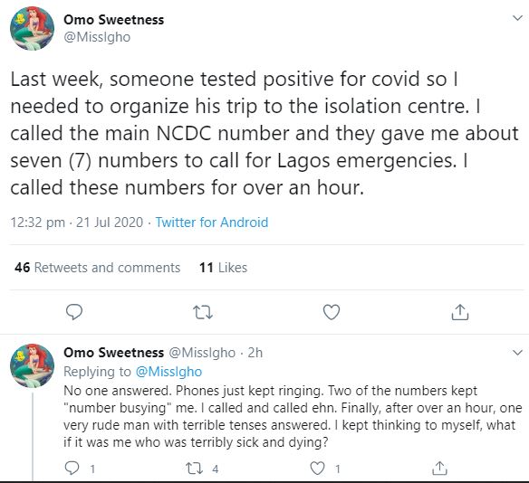 She said she called these numbers for over an hour before someone eventually picked. She stated that the person who picked wasn't of much help so she had to organize an ambulance to take the Coronavirus patient from Ikeja to Yaba.