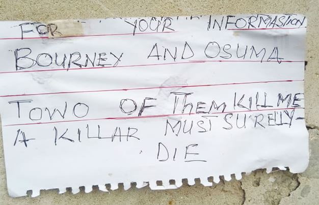 He wrote, “For your information, Bourney and Osuma. Two of them kill me. A killer must surely die.”