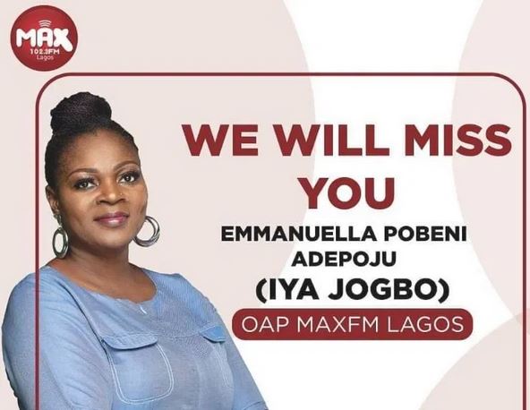 A popular Max FM Lagos radio presenter Iya Jogbo, with the real name Emmanuella Pobeni Adepoju, is dead.