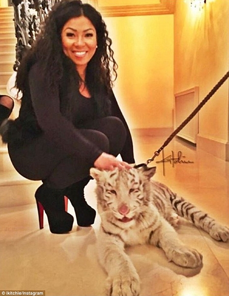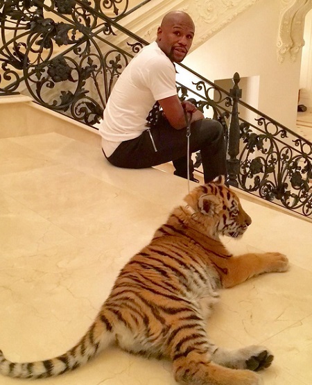 The 38-year-old was pictured sitting on the top of a marble staircase with the young tiger laying down next to him attached to a leash. The big cat had been given to Mayweather as a present and he invited his fans to suggest names for his pet.