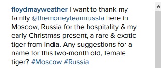 'I want to thank my family @themoneyteamrussia here in Moscow, Russia for the hospitality & my early Christmas present, a rare & exotic tiger from India. Any suggestions for a name for this two-month old, female tiger?'