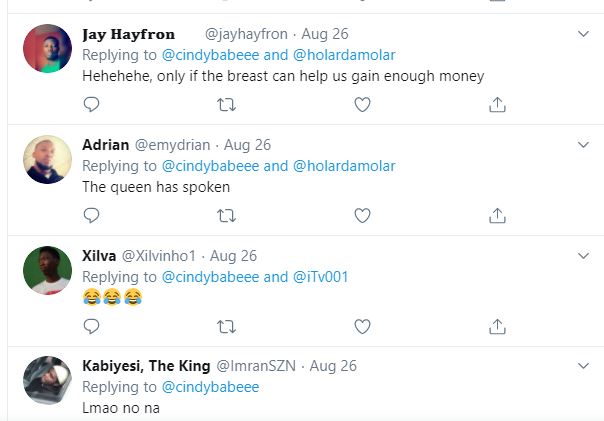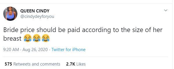 She tweeted, “bride price should be paid according to the size of her breast 😂😂😂